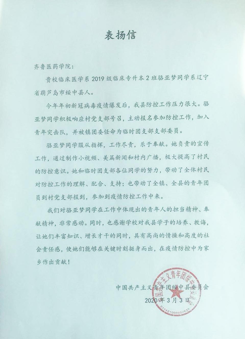 近日,齊魯醫藥學院臨床醫學院2019級臨床專升本2班駱亞夢同學(遼寧省葫蘆島市綏中縣人),因在疫情防控工作中表現出色,受到了共青團綏中縣委員會致信表揚。