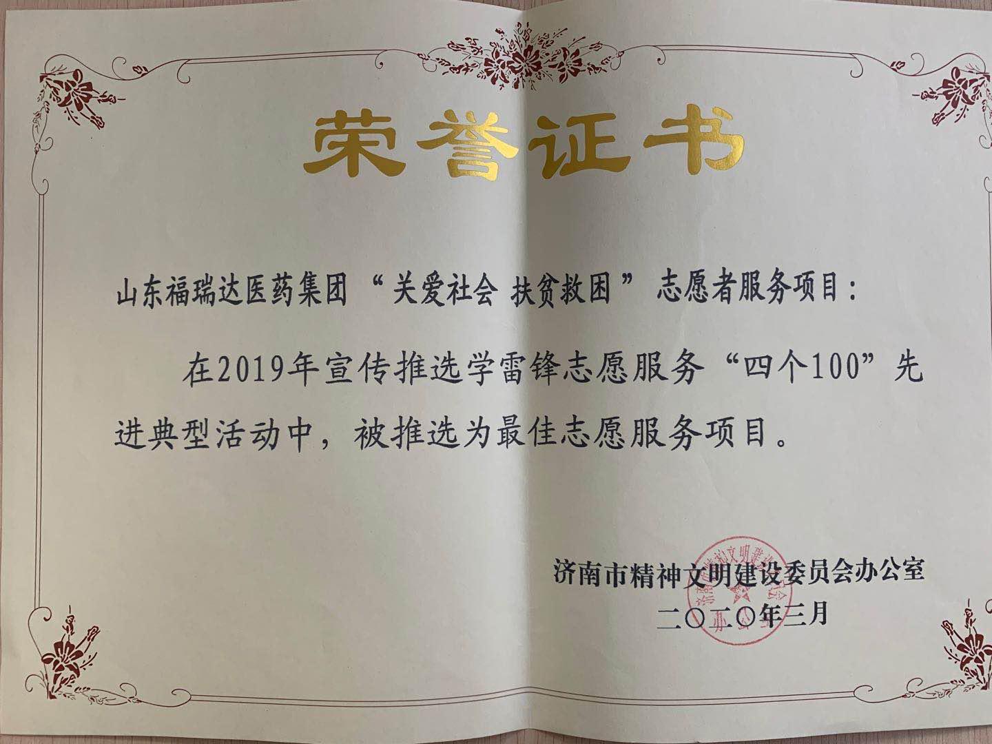 近期,福瑞達“關愛社會、扶貧救困”志愿服務項目在2019年度宣傳推選學雷鋒志愿服務“四個100”先進典型中,被推選為“濟南市最佳志愿服務項目”。