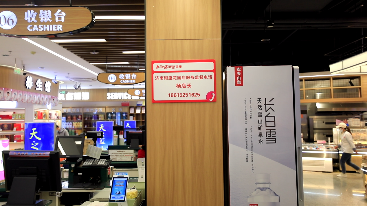 這讓筆者很難相信。直到看到了他們店里一個地方:在一樓收銀處的柱子上,一串大大的電話號碼赫然醒目,上面寫著“濟南銀座花園店服務監督電話楊店長”的字樣。
