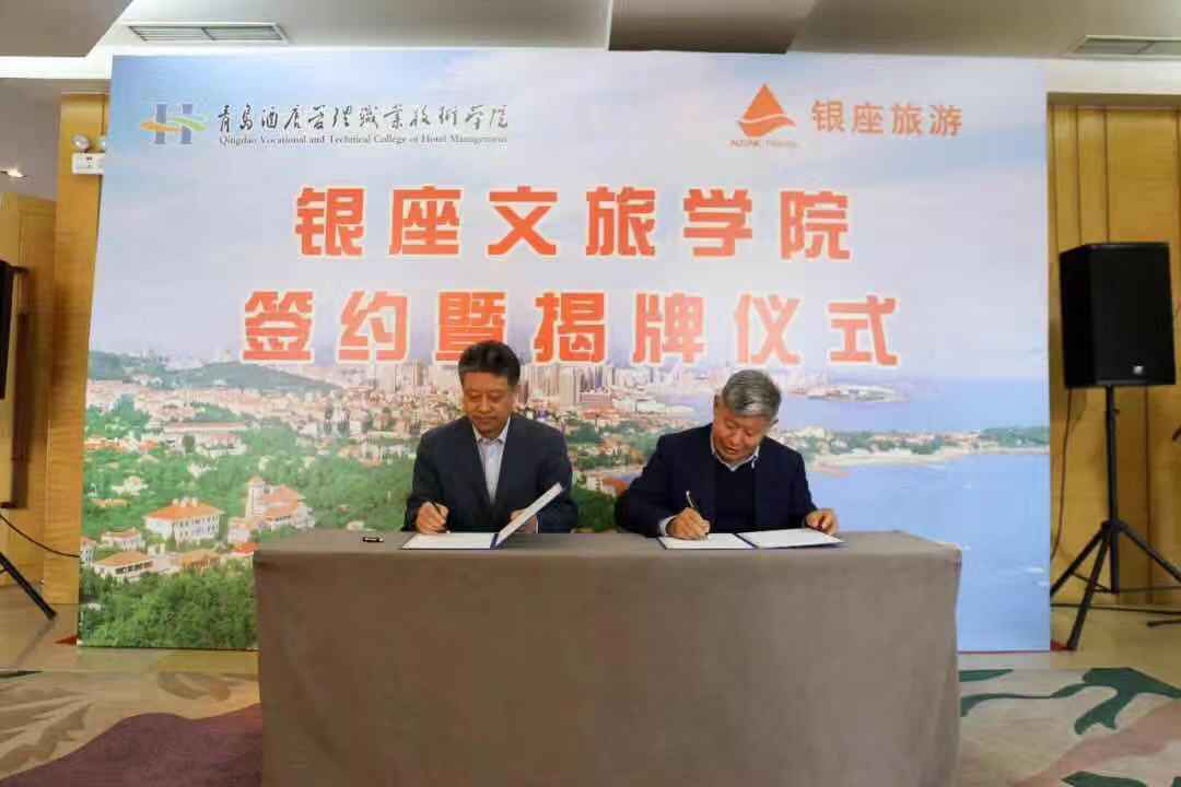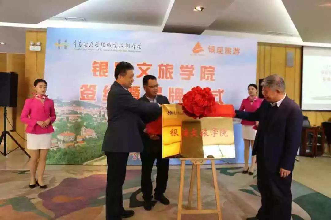 在同期舉行的銀座文旅學院簽約暨揭牌儀式上,山東銀座旅游集團黨委書記、董事長鄭良玉與青島酒店管理職業技術學院黨委書記李達代表合作雙方簽約,李達為鄭良玉頒發銀座文旅學院名譽院長證書。