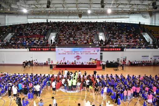 6月16日上午8:00,由中國民辦教育協會學前教育專業委員會主辦,山東銀座·英才幼兒園(集團)(以下簡稱銀座幼教)、北京銀座教育集團承辦,山東省籃球運動協會(以下簡稱省籃協)特別指導的全國第五屆“健康杯”幼兒籃球表演賽暨銀座幼教第十一屆幼兒籃球表演賽于濟南市歷城區體育中心拉開帷幕。來自全國七省市58支代表隊的近1200名幼兒齊聚泉城,參加了本次幼兒籃球盛事。