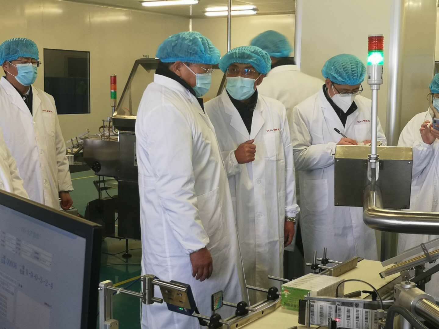 經過體溫測量、消毒等程序后,王忠林進入公司口服固體車間,參觀了抗疫藥物“小兒解感顆粒”包裝生產線,檢查了防疫措施落實和執行情況,并詳細詢問了口罩、酒精、消毒劑和生產原料等物資的儲備狀況。明仁福瑞達嚴格按照各級政府和魯商集團規定,制定了新冠肺炎疫情防控工作措施、實施方案、應急預案和開工方案,將體溫測量、出行登記、消毒、宣傳教育以及廠區、辦公區、餐廳等各項防疫措施做到實處,并在車間、辦公區和餐廳配備了全自動感應式霧化酒精消毒機,確保防疫措施責任到人,監督到位,所有人員保護到位。王忠林對此給予充分肯定,要求濟南市企業推廣“福瑞達消毒模式”。