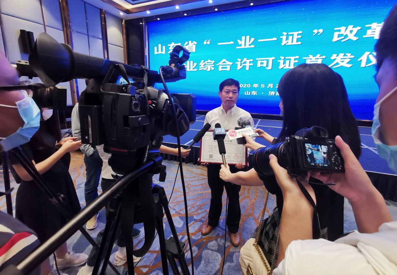 5月27日,山東省“一業一證”改革試點行業綜合許可證首證頒發儀式在濟南舉行。省委常委劉強出席儀式并致辭,副省長任愛榮向20個行業頒發了行業綜合許可證,魯商九女峰(泰安)鄉村振興有限公司負責人首個上臺領取許可證。
