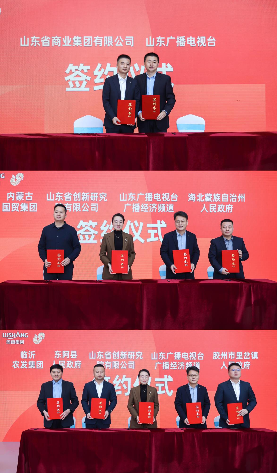 會上,內蒙古國貿集團、青海海北藏族自治州人民政府、聊城東阿縣人民政府、膠州里岔鎮人民政府、臨沂農發集團政企代表分別于與魯商集團、山東廣播電視臺等進行了合作簽約,標志著各方將在資源共享、產銷對接等方面展開深入合作,共同推動山東好品的煥新與發展。