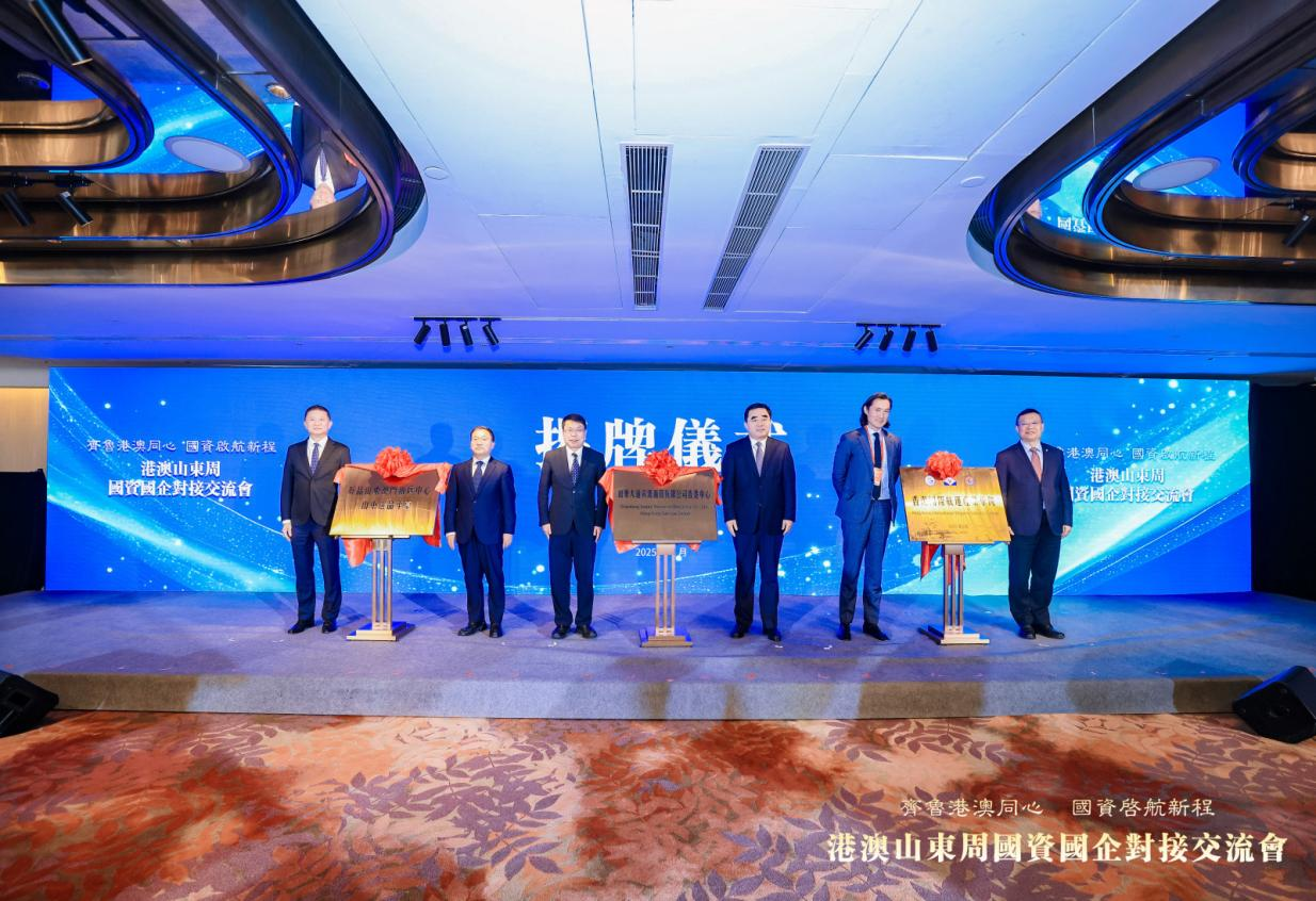 5月21日,“好品山東澳門推廣中心山東選品平臺”在港澳山東周國資國企對接交流會上舉行揭牌儀式。山東省政協常委、澳門山東社團總會理事長陳捷,魯商集團黨委副書記、董事、總經理朱華建共同為平臺揭牌。