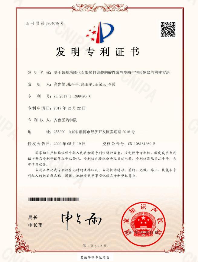 近日,齊魯醫藥學院教師高先娟、張平平、張玉軍,學生王保玉、教師李霞的自主研發成果《基于巰基功能化石墨烯自組裝的酸性磷酸酯酶生物傳感器的構建方法》(專利號:ZL 201711399495.X)成功獲得國家發明專利。該成果于2017年12月申報,2020年5月獲得專利證書。