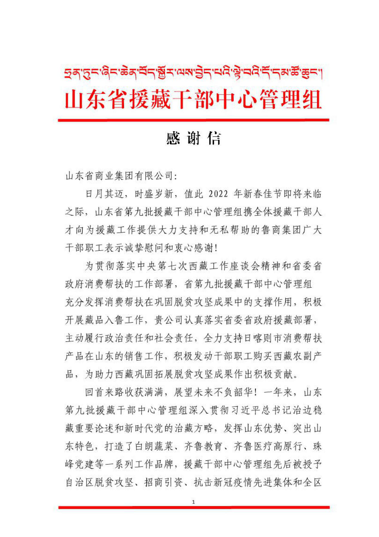 近日,魯商集團分別收到山東省對口支援新疆工作指揮部、山東省第九批援藏干部中心管理組、山東省對口支援青海干部管理組、山東省協作重慶干部管理組、山東省協作甘肅干部管理組發來的感謝信,對集團近年來在對口支援和東西部協作工作中給予的支持和幫助表示肯定和感謝。