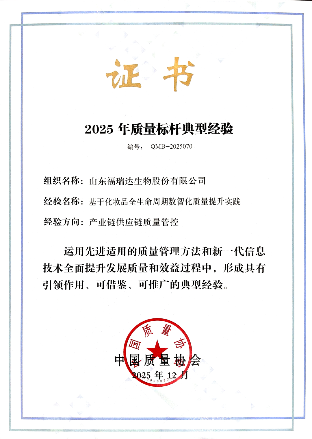 為助力培育產品卓越、品牌卓著、創新領先、治理現代的世界一流企業,2025年中國質量協會持續開展質量標桿典型經驗征集與交流活動。活動嚴格遵循《質量標桿典型經驗征集管理辦法》,經過多輪嚴格篩選,最終從質量管理數字化、質量管理模式變革、質量管理推進機制建立、產業鏈供應鏈質量管控等多個關鍵領域,評選出74項具有示范引領作用的典型經驗,福瑞達生物股份的實踐經驗在產業鏈供應鏈質量管控方向脫穎而出。
