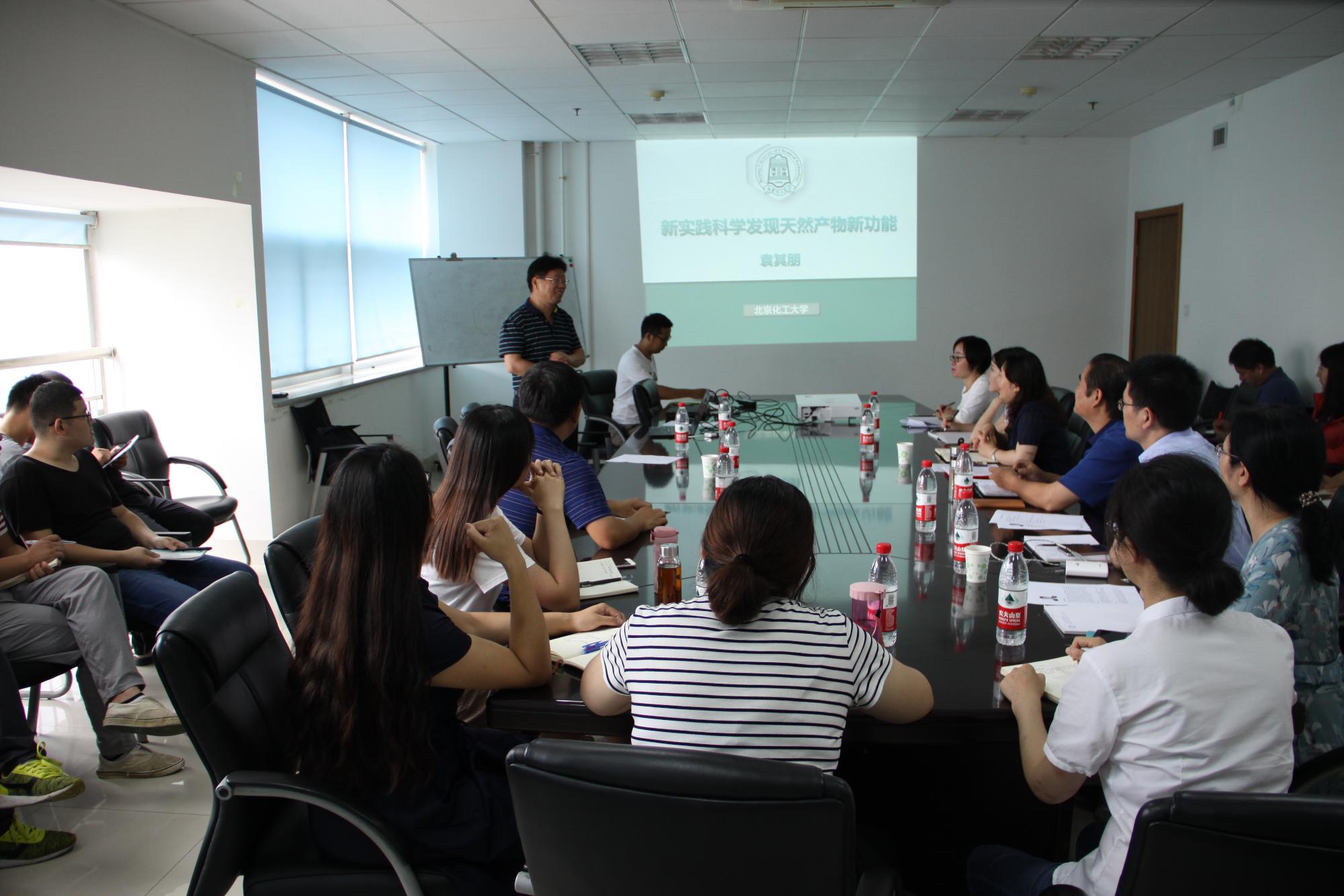 在題為《新實踐科學發現天然產物新物質》的報告中,袁其朋介紹了其科研團隊在天然活性成分的生物合成、半合成、高效分離技術及十字花科植物的抗癌活性、作用機制方面的研究成果。在題為《活性天然產物的生物合成》的報告中,袁其朋展示了生物合成理論的運用,通過對酶分子的理性改造、微生物代謝流調控等技術手段,構建高效表達系統,成功實現精細化學品及大宗化學品的工業化生產。報告內容清晰生動、實例豐富,富有啟發性,激發了與會者濃厚興趣。講座中,袁其朋與大家進行了廣泛深入的科研探討。