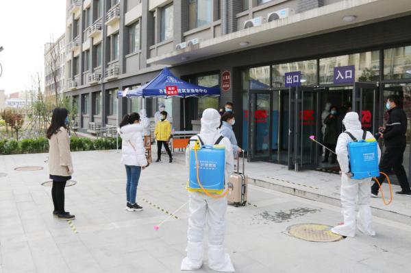 醫務人員對體溫異常同學進行腋下體溫復查,體溫顯示正常,做好信息登記、行李消毒后,允許該同學入校,工作人員對留觀點進行全面消毒。