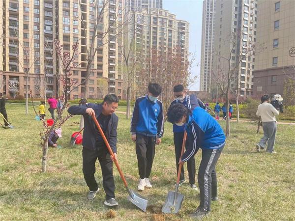 在植樹現場,大家分工協作,有的揮鍬培土,有的提水澆灌,一派熱火朝天的忙碌景象。新栽下的樹木昂然挺立,在春風中煥發出勃勃生機,將小區裝點得生機盎然。
