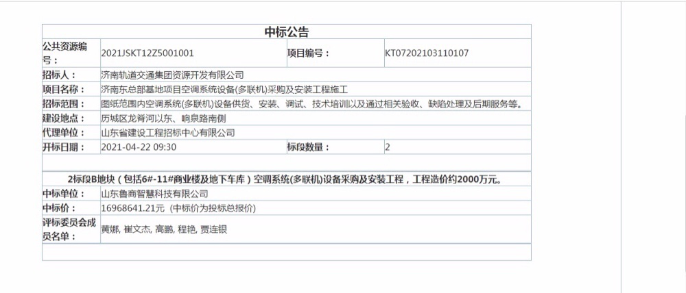 近日,在濟南軌道交通集團關于濟南東總部基地項目空調設備(多聯機)采購及安裝工程施工項目競標中,魯商智慧科技公司順利中標該項目,中標金額約1697萬元。