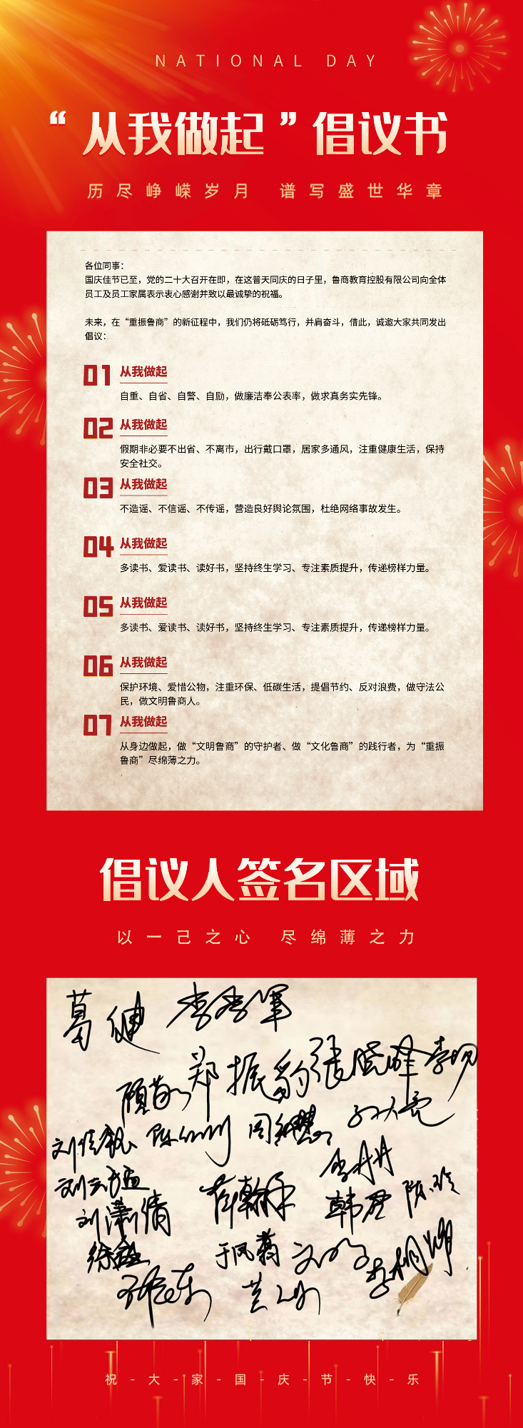 會后,公司組織全體干部職工參與“從我做起”倡議書簽名活動,倡議書從廉政、勤儉、防疫、安全、學習、工作、生活等方面發出倡議,號召大家做“文明魯商”的守護者,做“文化魯商”的踐行者,在“重振魯商”新征程中砥礪篤行、并肩奮斗,以實際行動迎接黨的二十大勝利召開。