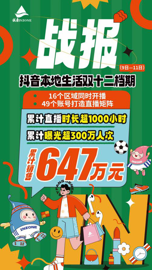 活動檔期,銀座集團各區域上午10:30準時在抖音平臺開啟直播盛宴,涵蓋貴賓卡、百貨、超市、美妝、美食、家電等品類,通過多種促銷方式聯動為門店引流聚客。活動期間,共有57個賬號同時開播,直播時長超1212小時,直播間曝光量超500萬人次。銀座集團還搶抓抖音本地生活“心動觀賽季”熱點,爭取平臺補貼近200萬元,銷售位居“到店綜合行業”第一名。