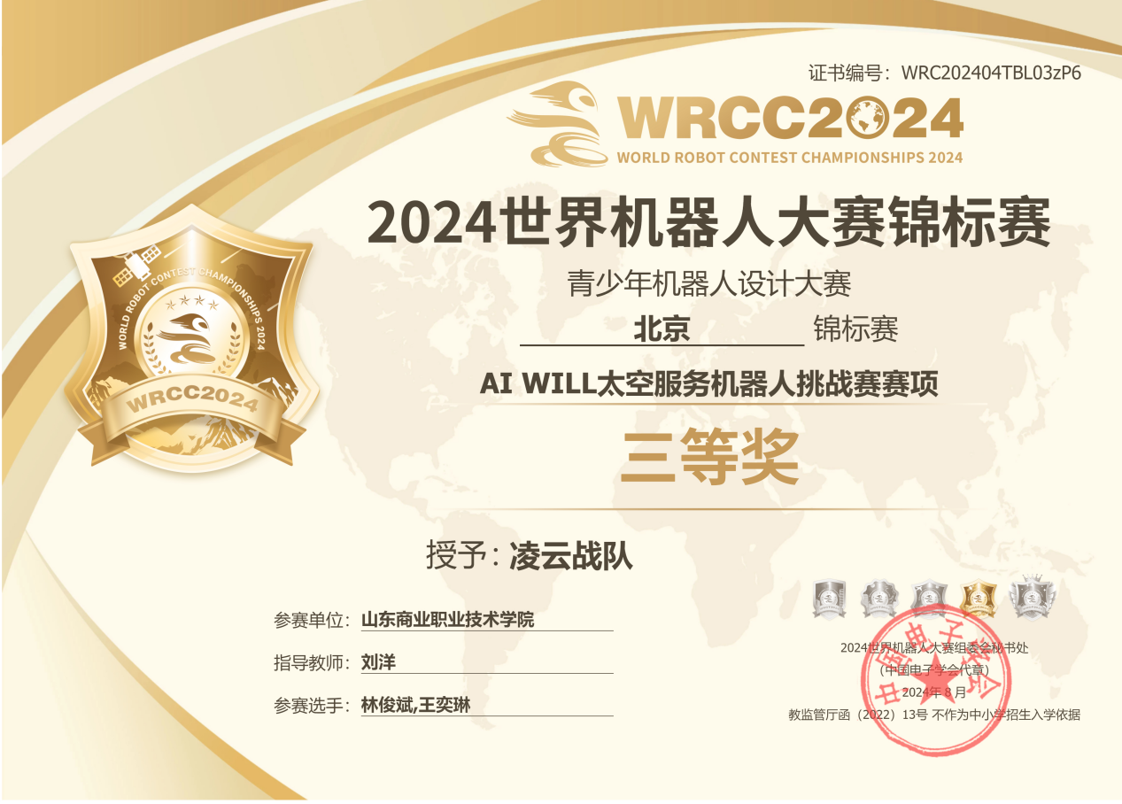 近日,2024世界機器人大賽北京錦標賽結束,山東商職學院選派的“凌云戰隊”在AI WILL太空服務機器人賽項中,喜獲三等獎。