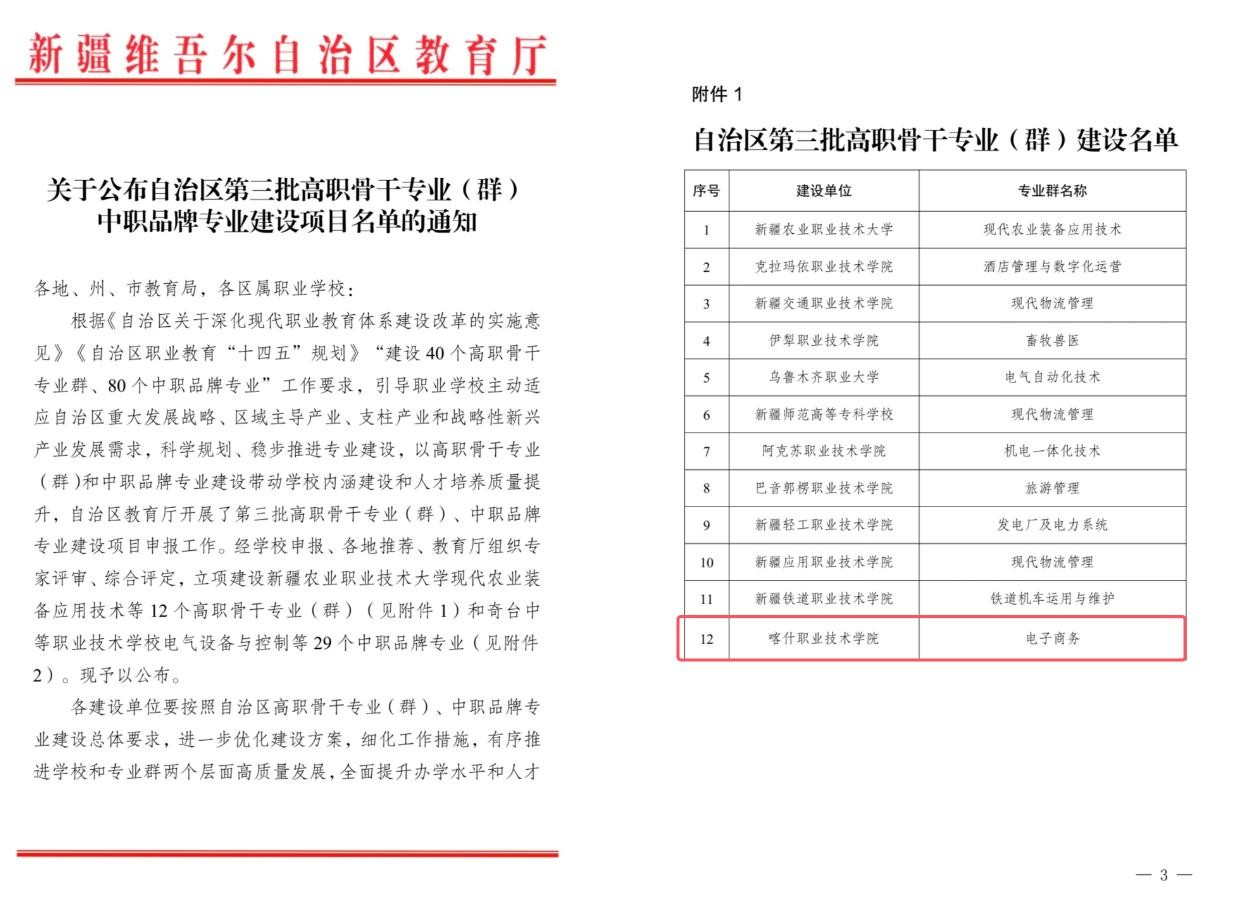 近日,新疆維吾爾自治區教育廳公布了自治區第三批高職骨干專業(群)及中職品牌專業建設項目的獲獎名單,由山東商職學院托管的喀什職業技術學院商貿流通工程技術學院提交的“電子商務專業群”項目,成功獲得立項。