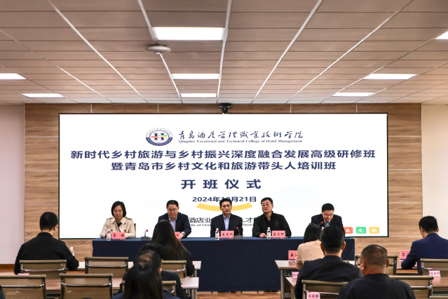 10月21日,由山東省人力資源和社會保障廳、青島市人力資源和社會保障局主辦、青島酒店管理職院承辦的新時代鄉村旅游與鄉村振興深度融合發展高級研修班暨青島市鄉村文化和旅游帶頭人培訓班開班。青島市文旅局一級調研員竇文輝,青島市人社局專技處處長、一級調研員宋平,青島酒店管理職院校長姜玉鵬參加開班儀式。