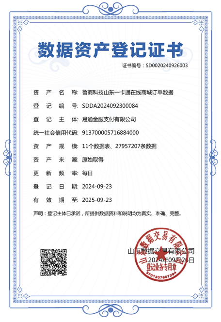 本次入表的“山東一卡通在線商城訂單數據”基于公司權屬單位易通金服沉淀的海量平臺運營數據,魯商科技通過深度清洗加工、合規確權、質量評價等,形成高質量數據集,并順利獲得數據資源、數據資產、數據知識產權3類登記證書。