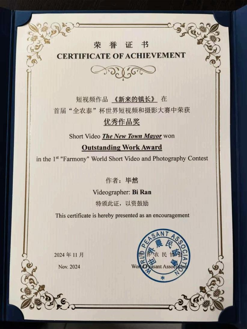 日前,首屆“全農泰”杯世界短視頻和攝影大賽頒獎典禮在塞浦路斯成功舉辦。本次大賽由世界農民協會主辦,旨在展現世界鄉村生產、生活、生態以及民風民俗之美。由山東城市服務職院出品的主旋律短片《剛來的鎮長》在眾多優秀作品中脫穎而出,榮優秀作品獎。