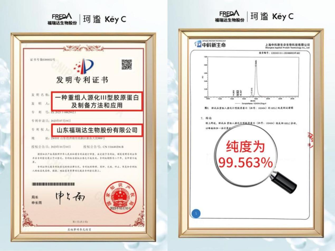 2024年福瑞達成功完成醫用級重組Ⅲ型人源化膠原蛋白原材料主文檔登記,正式踏入醫療器械高標準賽道。投資過億元建成的膠原蛋白醫療器械智能化生產基地,是山東省首個重組膠原蛋白原料量產基地。依托福瑞達“妝藥同源”協同創新優勢,珂謐KeyC已儲備多項專利技術,為產品的持續迭代提供了堅實支撐。