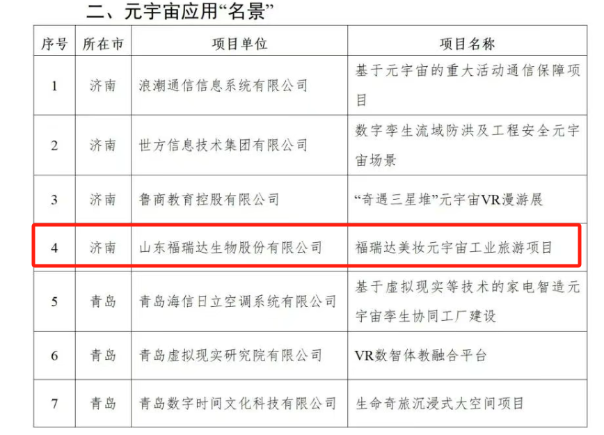 近日,山東省工業和信息化廳正式公布2025年度山東省元宇宙創新“名品”應用“名景”名單,山東福瑞達生物股份有限公司打造的“美妝元宇宙工業旅游項目”入選元宇宙應用“名景”,成為山東省元宇宙產業創新發展的“美麗名片”。