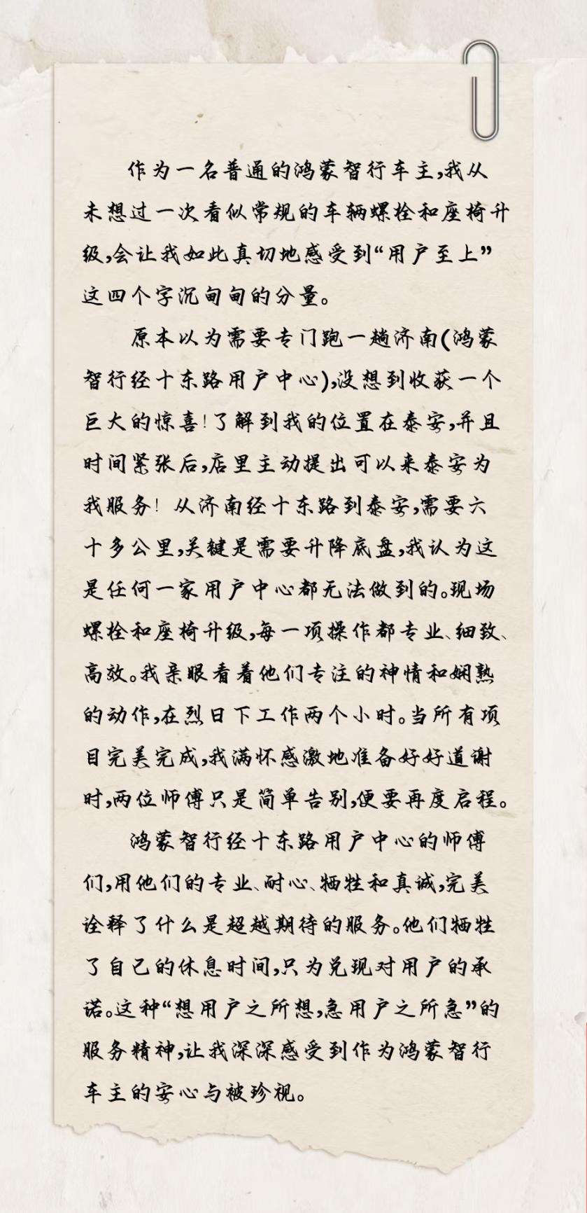 濟南到泰安路程不短,客戶到店一次來回就要耗費大半天時間。了解到客戶需求以后,鴻蒙智行經十東路用戶中心的同事專程趕到泰安,在客戶公司樓下完成了座椅升級項目。客戶對這次服務體驗非常滿意,將其發布到抖音平臺后,獲得了10W+瀏覽量,近三千點贊,評論區里大量網友都為這樣極致貼心的服務點贊。真正便利、真誠、透明的服務,創造出超預期的情感連接,讓更多用戶了解并享受到服務到家的福利。